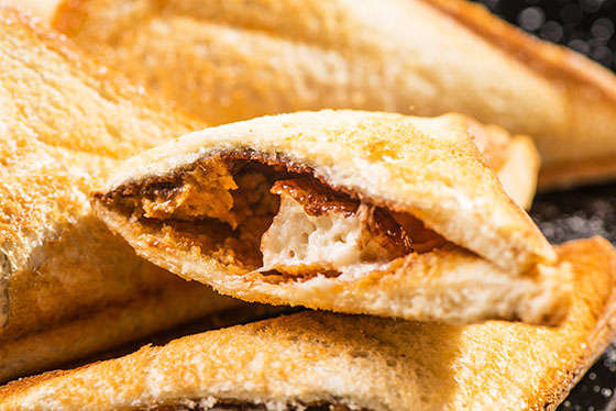 將多樣甜蜜緊密熱壓,以高溫把花生、巧克力與棉花糖融為一體,酥軟的吐司、超甜蜜的多層次內餡,滿足小餓食慾,也溫暖心靈。